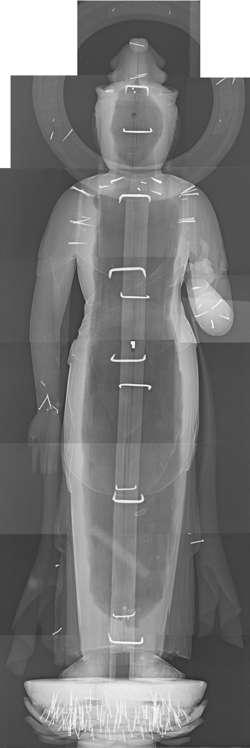山梨県甲斐善光寺に所蔵される重要文化財「木造阿弥陀三尊像」の調査において、エックス線装置が活用された例となります。
