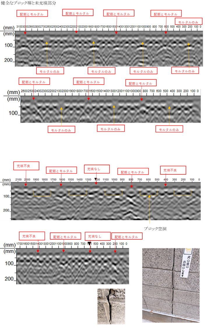 外部からは確認できないブロック内部の充填不良や配筋状況を可視化し、ブロック塀の診断を目的としています。